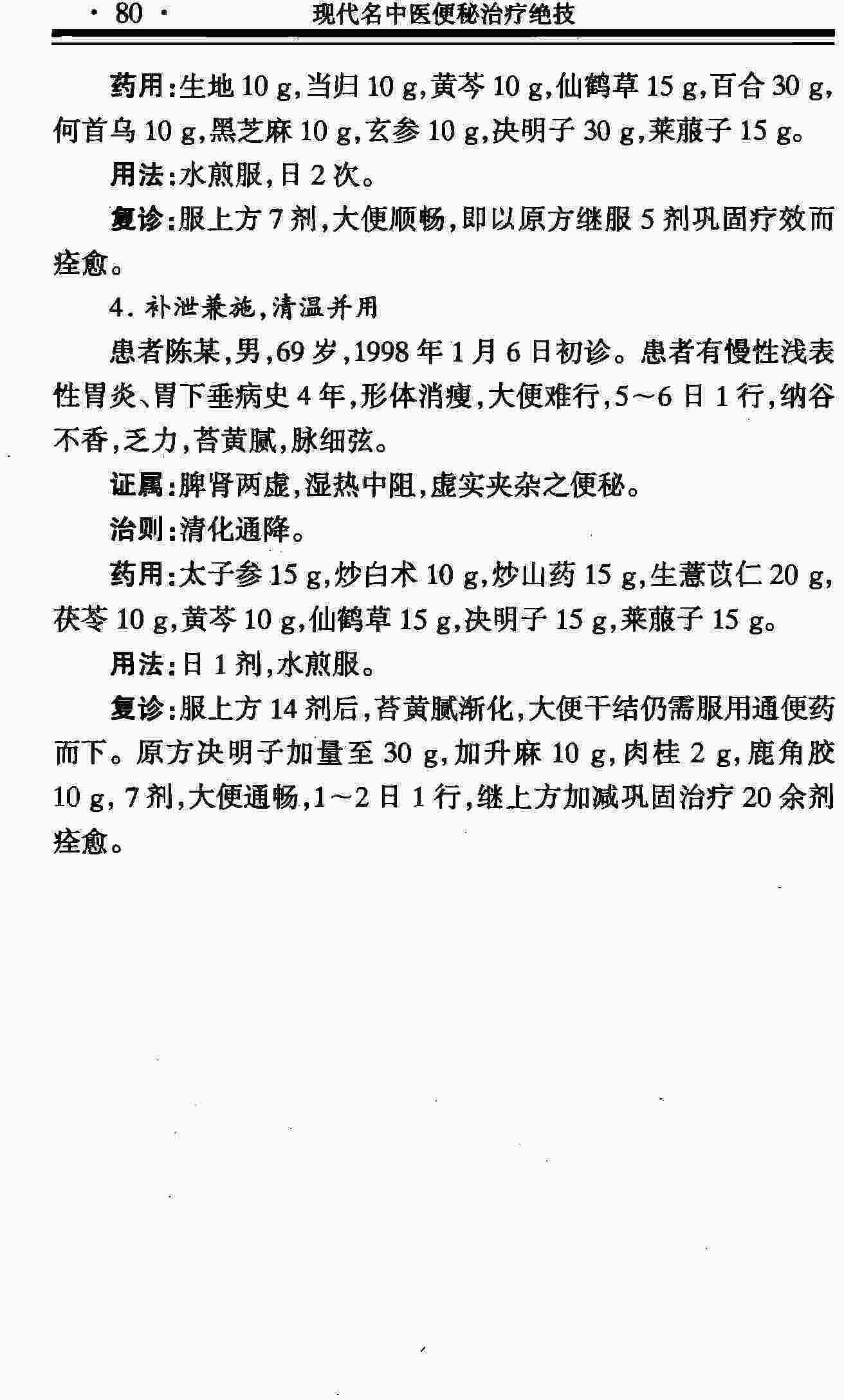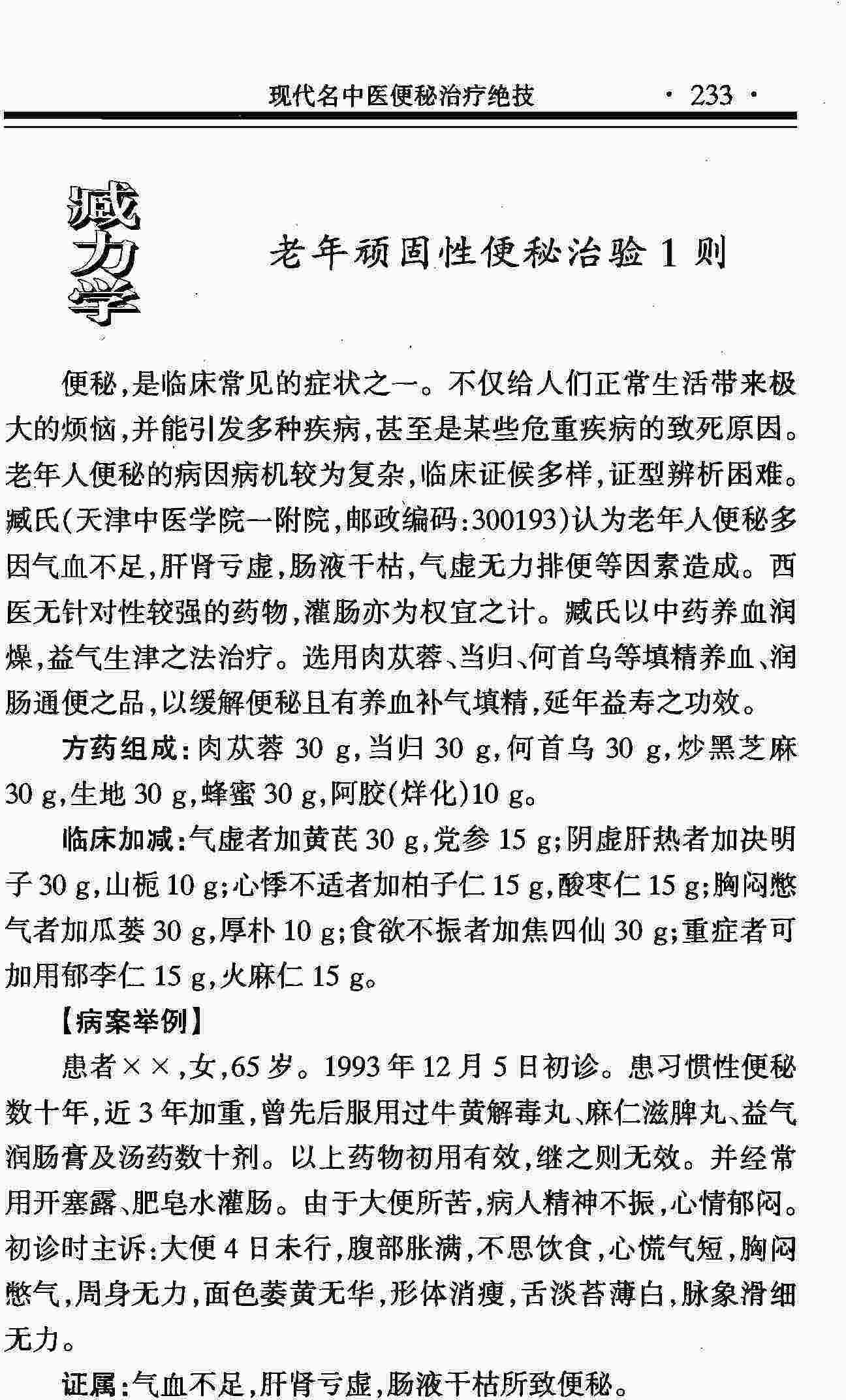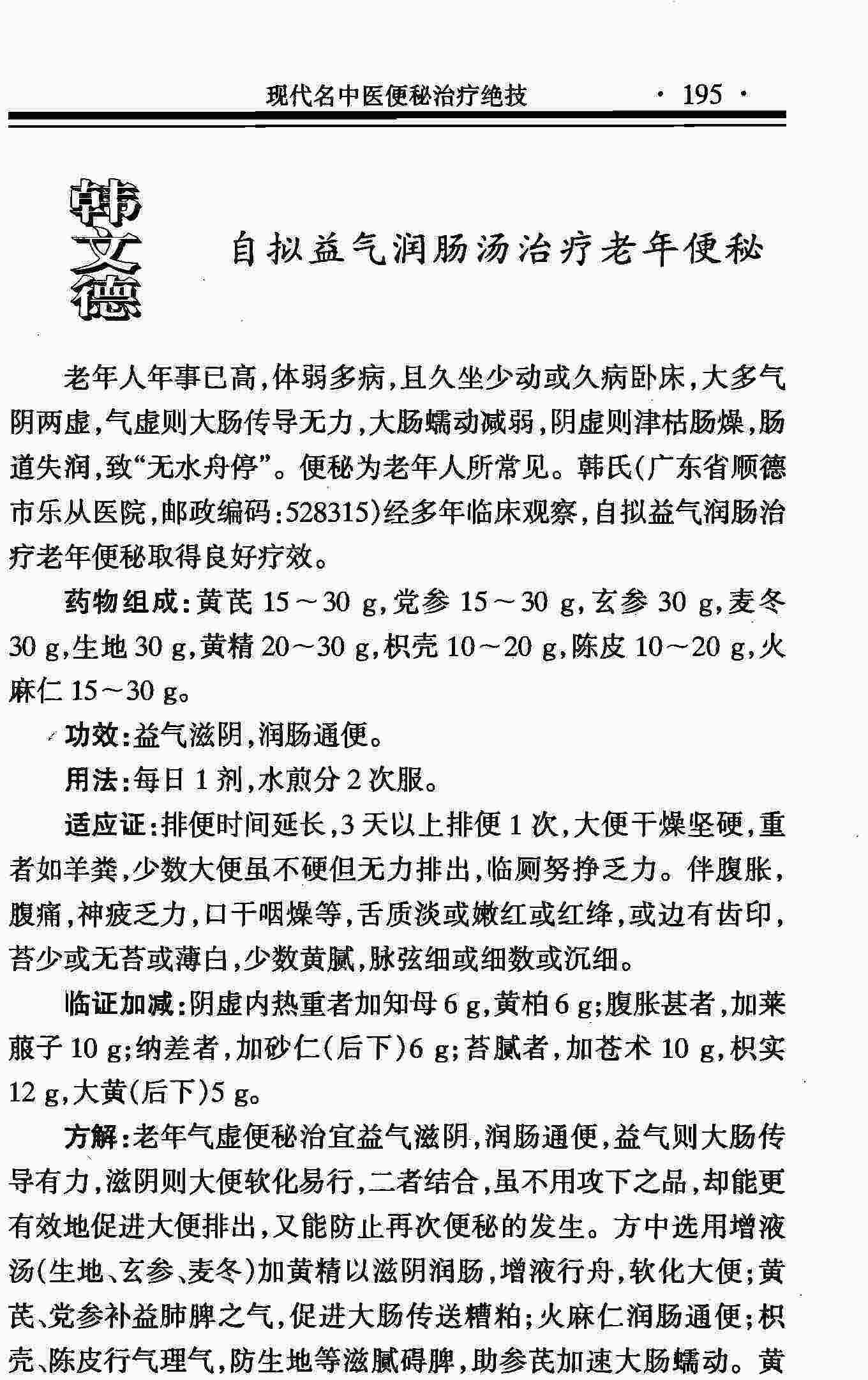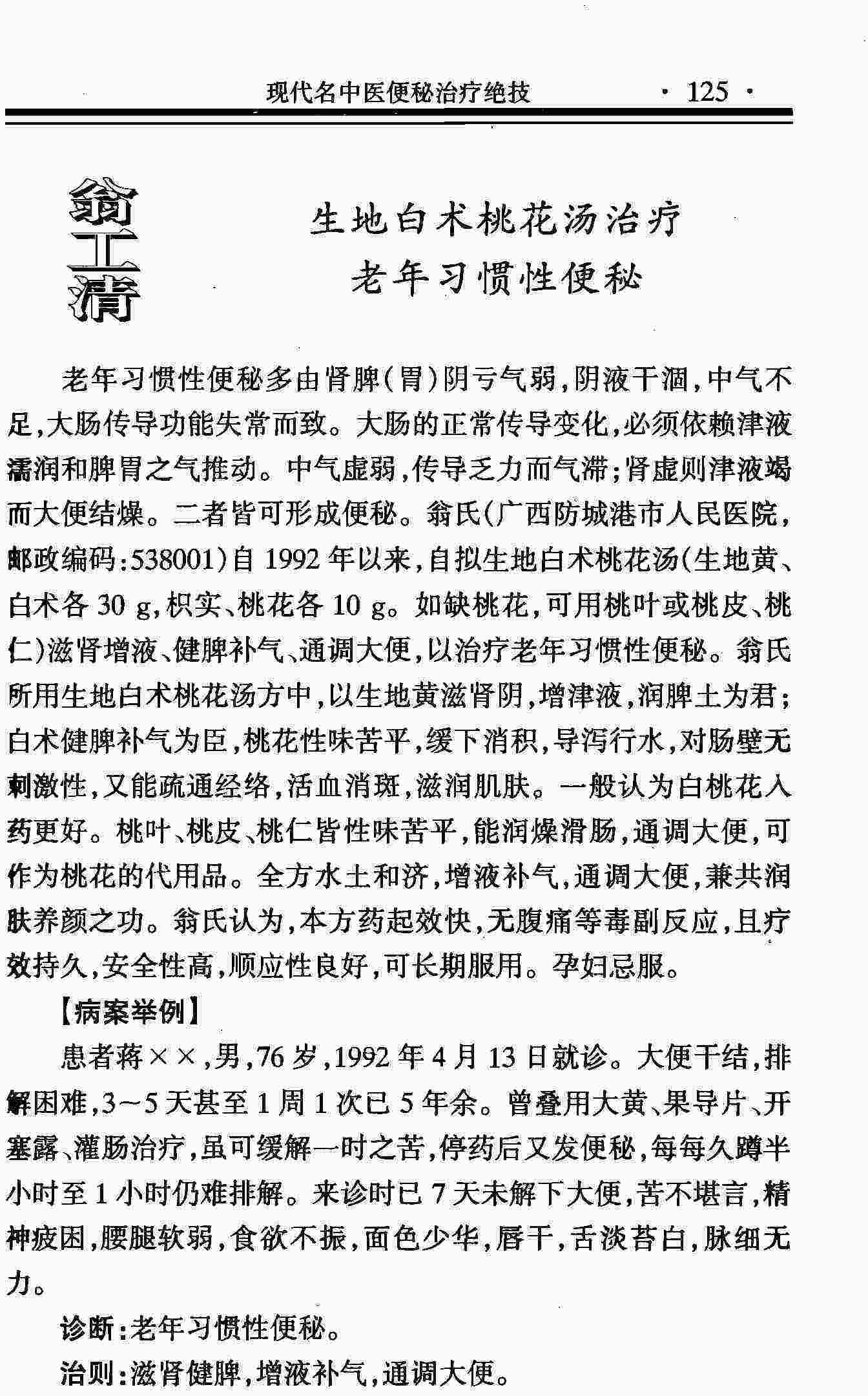翁工清 生地白术桃花汤治疗老年习惯性便秘