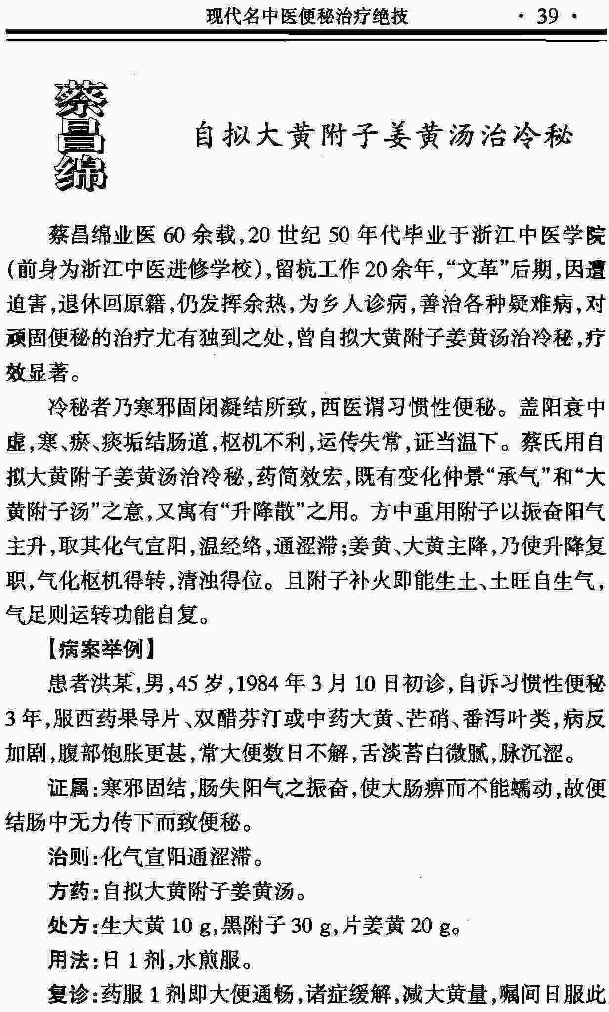 藩昌绵 自拟大黄附子姜黄汤治冷秘