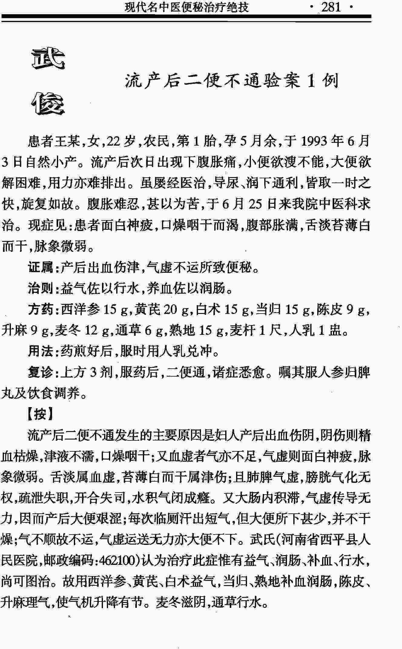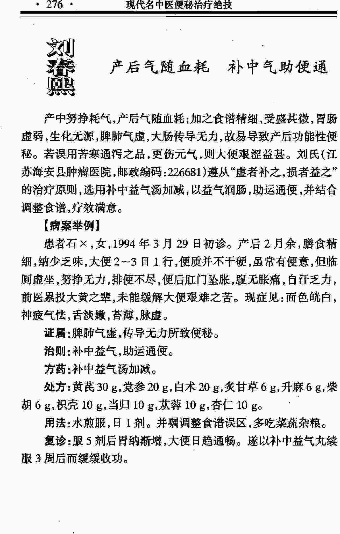 刘春熙 疏肝调脾通便治产后便秘验案1则