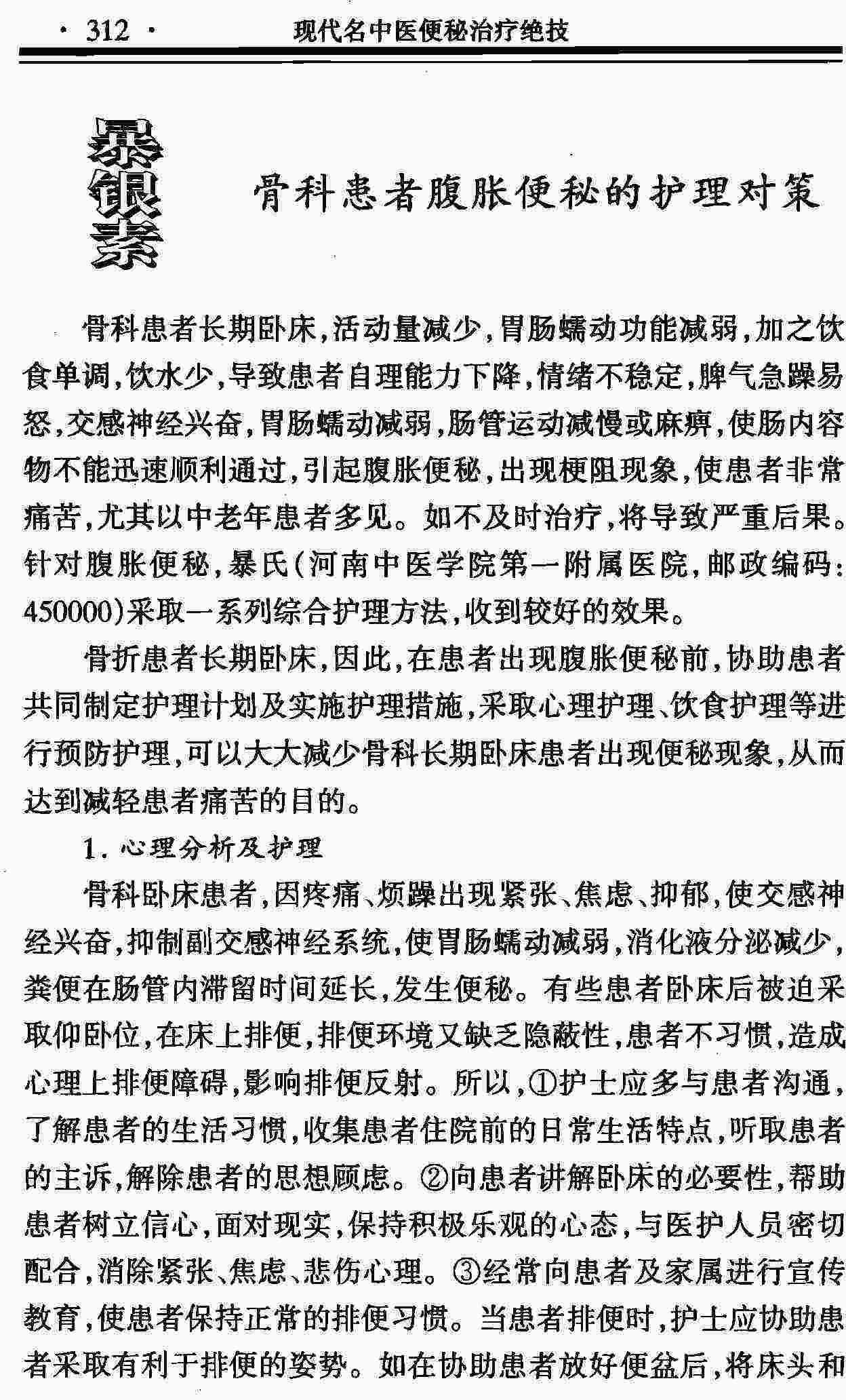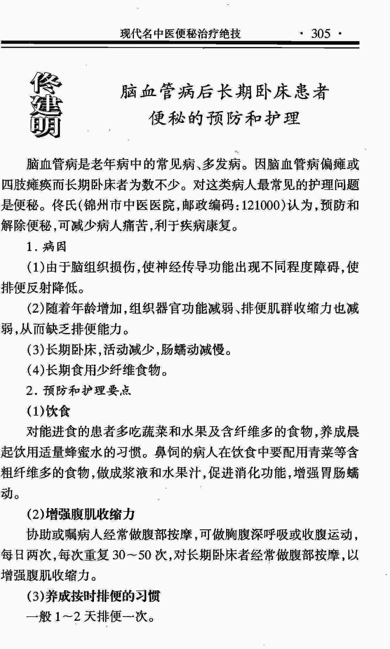 佟建明 脑血管病后长期卧床患者便秘的预防和护理