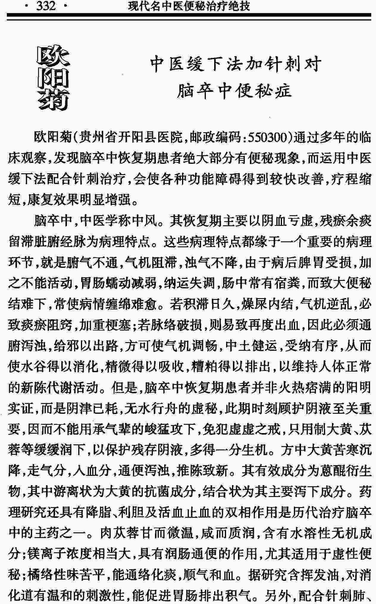 欧阳菊 中医缓下法加针刺对脑卒中便秘症