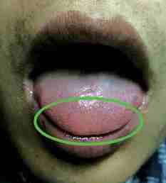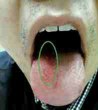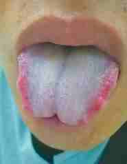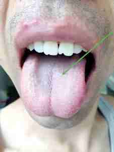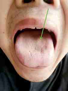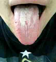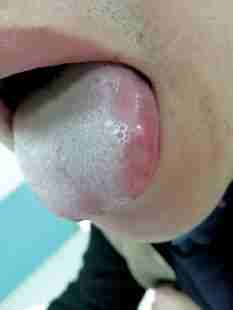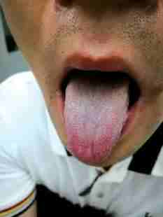 有次看了一个小伙子,舌头一伸(图1),整体看还好,但是有一块地方红红的没苔。