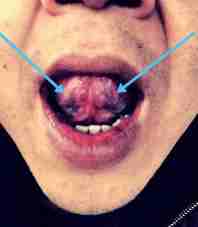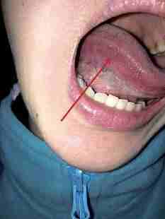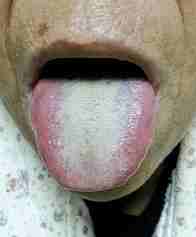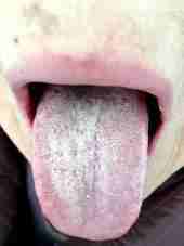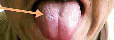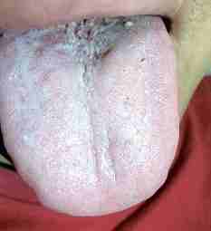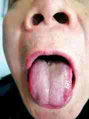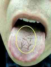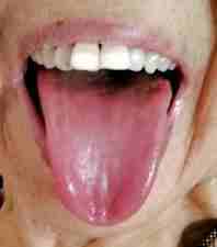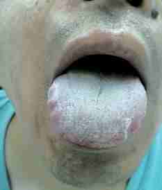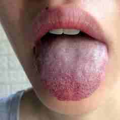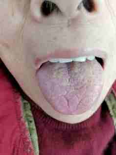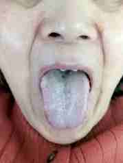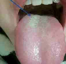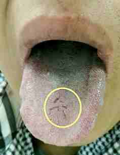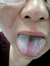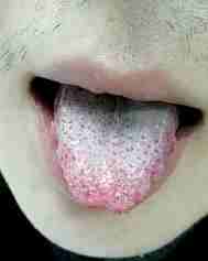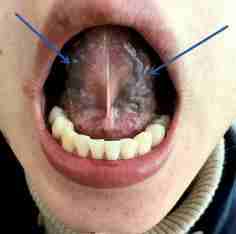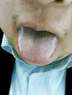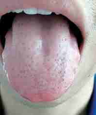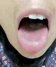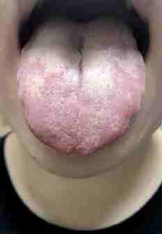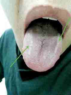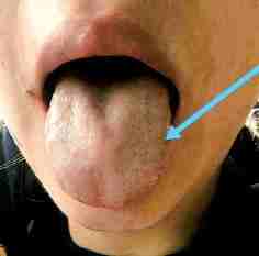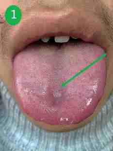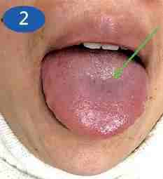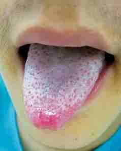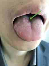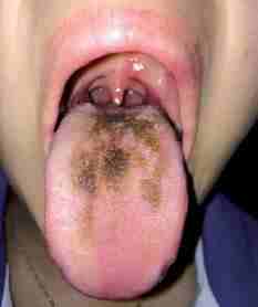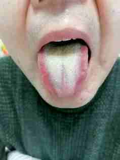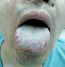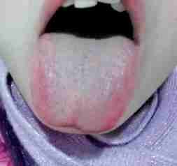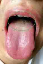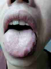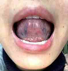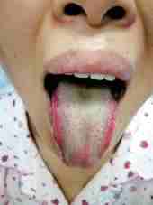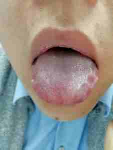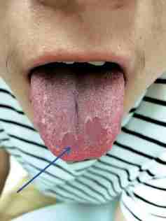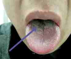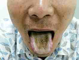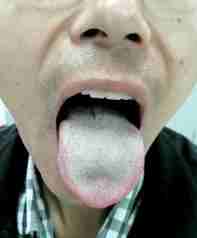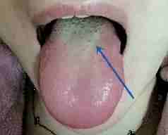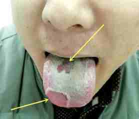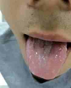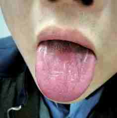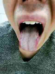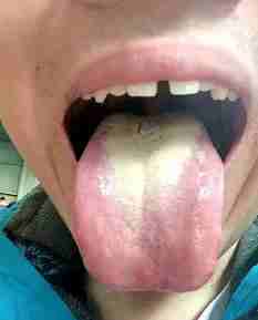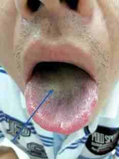 图202这个患者舌头和口腔长了溃疡,自己服用了一周头孢类药物,舌头就变成这样的黑苔了,口腔溃疡依旧没好。