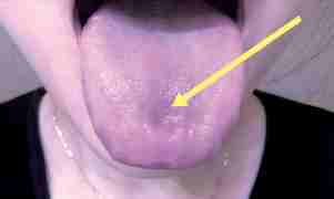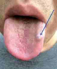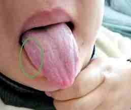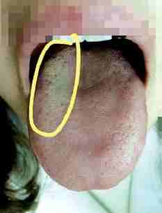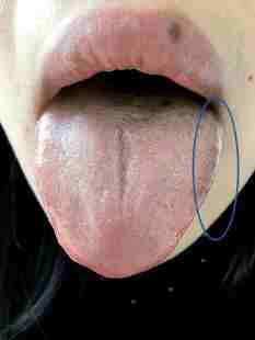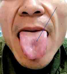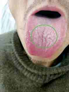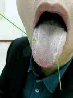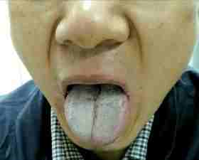 请看,这里一侧舌苔独厚,积聚了一团黄腻苔。