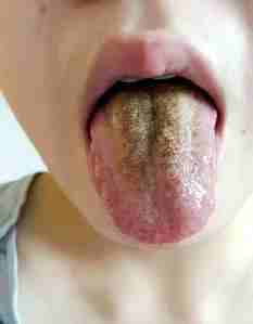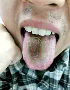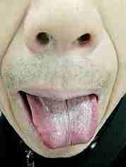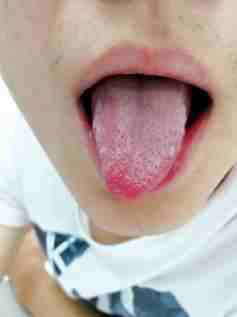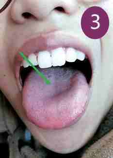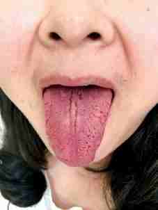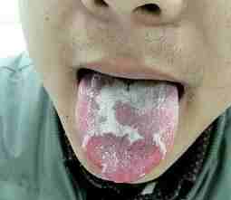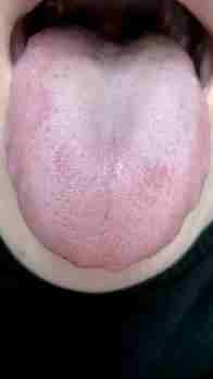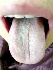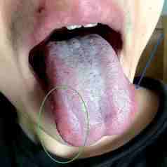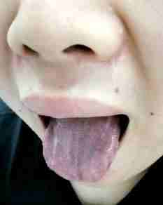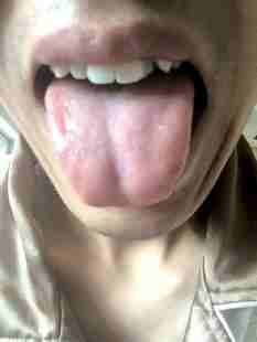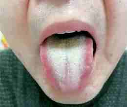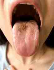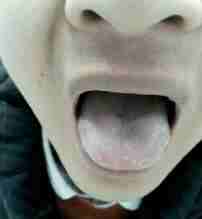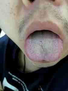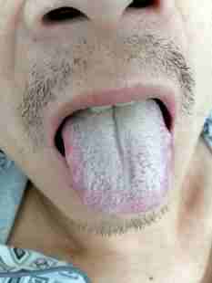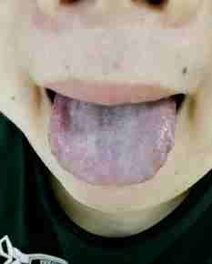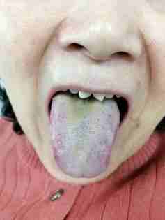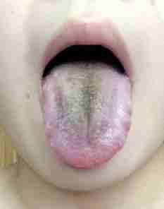 图200这个姑娘平时不抽烟,舌苔焦黄发黑,她并没有染苔,她是吃了一段时间抗生素以后,菌群失调出现的黑苔,我把这种吃了抗生素以后出现的焦黑苔舌头称为:抗生素舌。