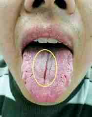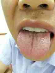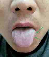 舌质只有红白之分,所以张仲景说的舌黄应该指的是苔黄,图196、图197这个患者就比较典型。