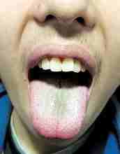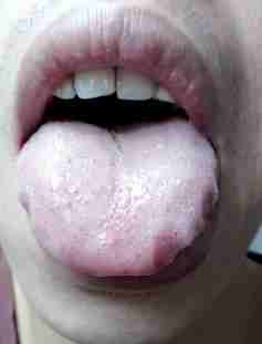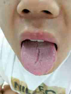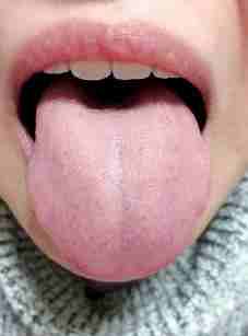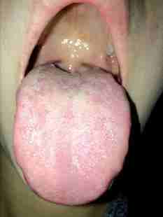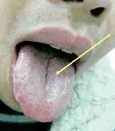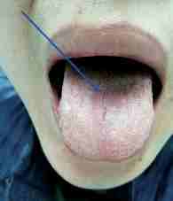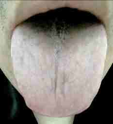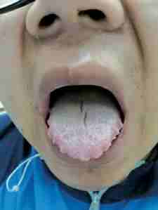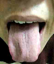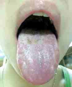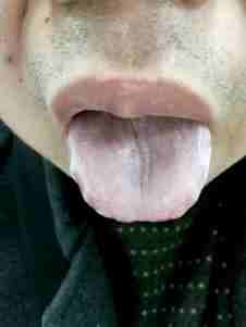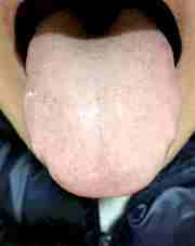 图216这位患者舌体有齿痕,表面覆盖一次薄薄的黄苔,有少许裂纹,但是舌苔尚属饱满。